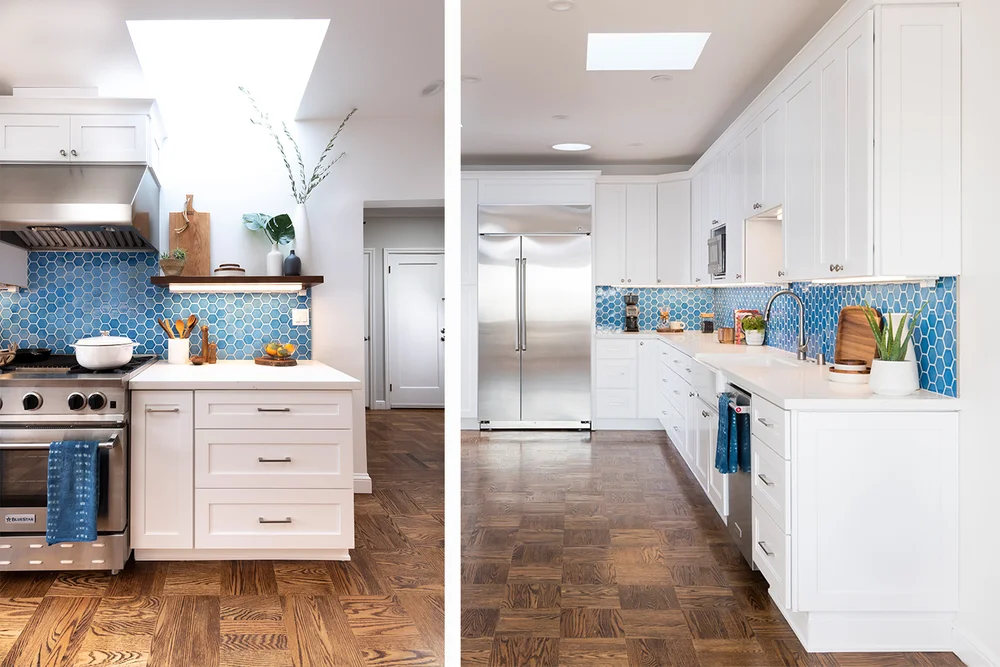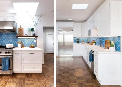 The original kitchen in this home was an isolated, “landlocked” room with no exterior views. To better reflect the homeowners’ warm and contemporary aesthetic, an open, family-friendly kitchen floor plan was proposed. Demolishing the walls dividing the kitchen from the dining area allowed for the generous window in the dining area to flood the kitchen with natural light. Original skylights were preserved to provide additional daylight. With the new layout, the amount of storage was increased with new upper and lower cabinetry. A refresh of the decor paired with bright finish selections makes this kitchen clean and inviting.