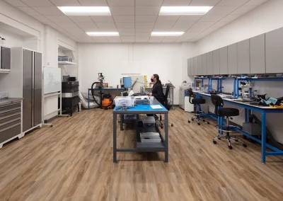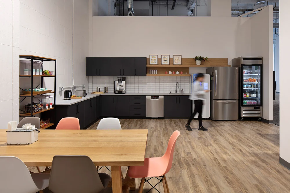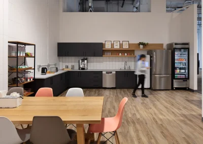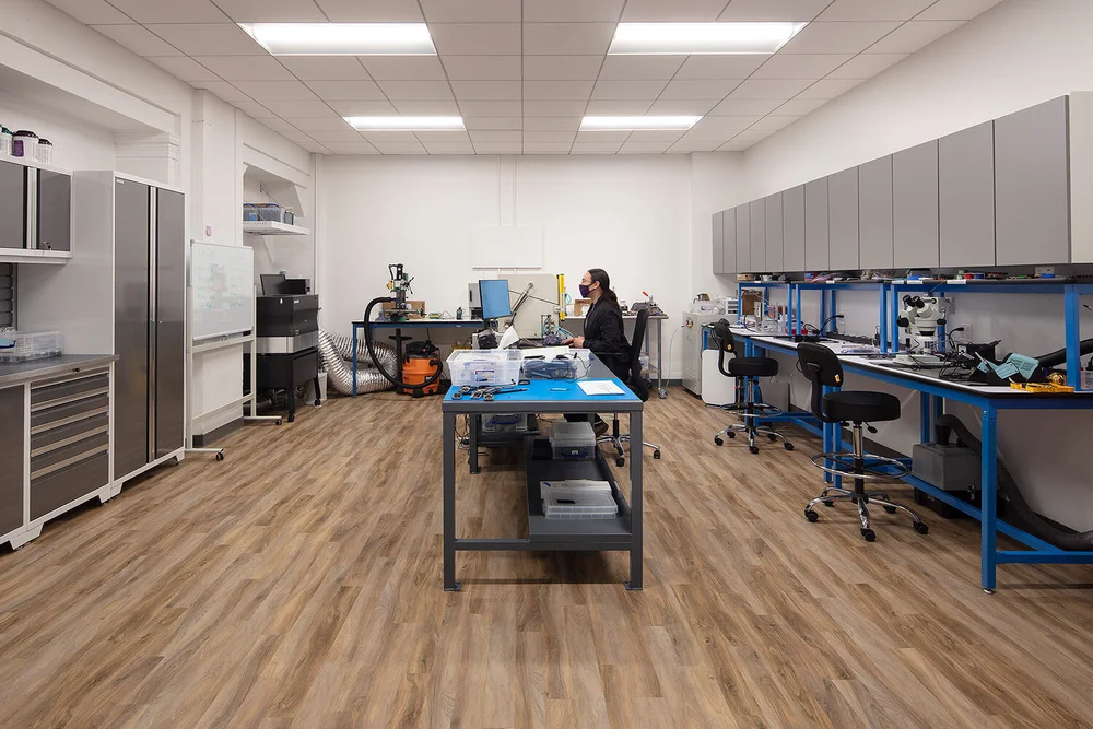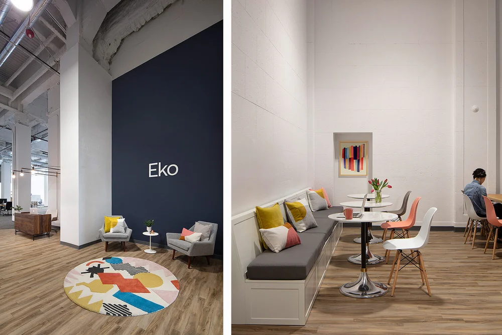 Eko’s new office space started with great architectural features: high ceilings and large, street-facing windows. Shelterwerk added a row of meeting rooms along the interior corner to maintain a bright and airy open office for team workstations. Each meeting room is accented with a branding color, visible from the open office through glass partitions. The break room in the back features a minimalist palette with suspended oak shelving. A spacious lab highlighting Eko’s advanced stethoscope product development is located just off of reception for easy visitor access.