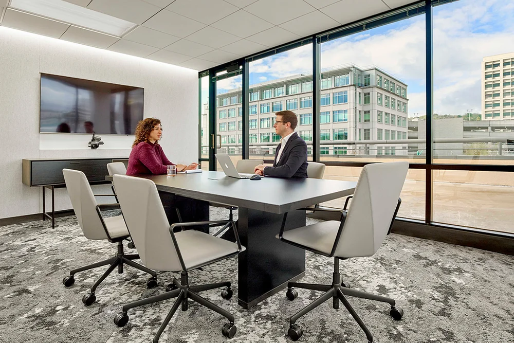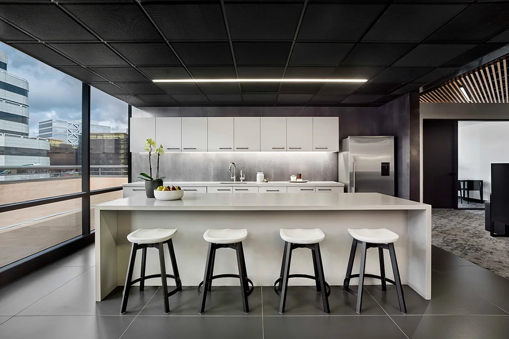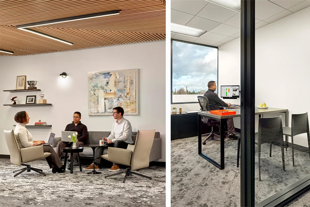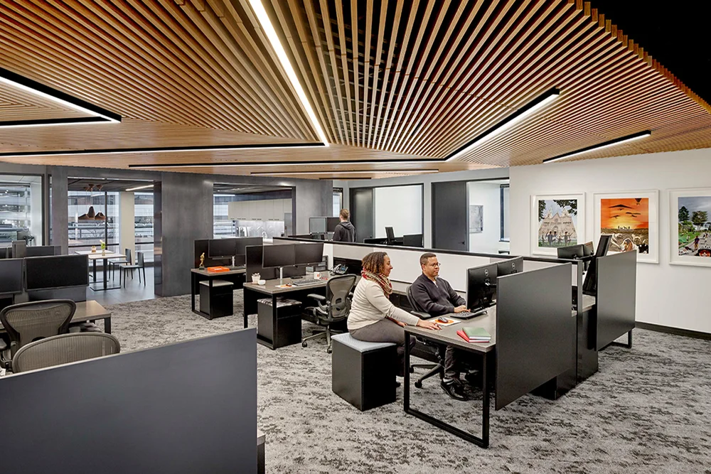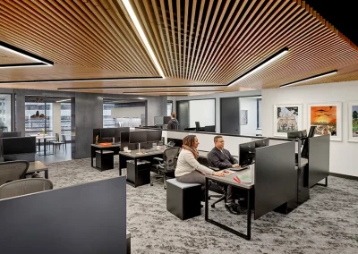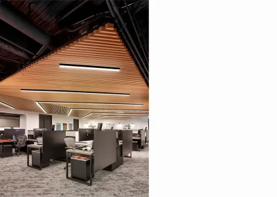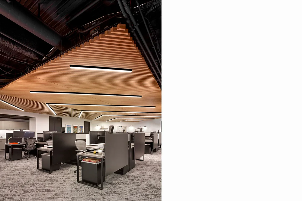 G2 Insurance desired a sophisticated and modern monochromatic palette for this second satellite office. A custom angled wood ceiling was designed to add warmth to the muted gray color scheme and to also function acoustically by absorbing sounds in the open office area.