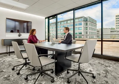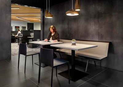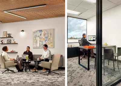 The office renovation included combining two separate office suites into a single larger suite. Some of the perimeter private offices were salvaged, but the remainder of the space was completely demolished and reconfigured. An inviting break area and lounge were added as multipurpose spaces for visitors and staff to lounge in and for independent or group work away from a desk.