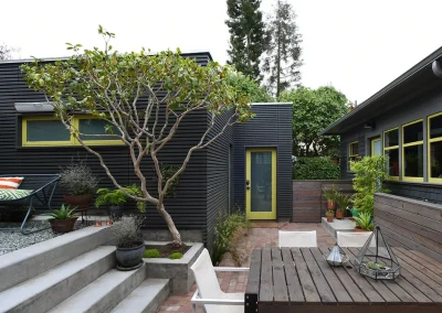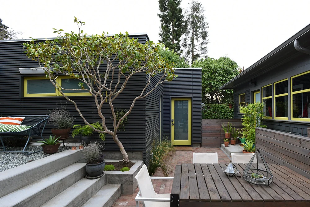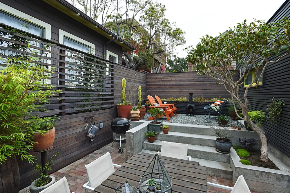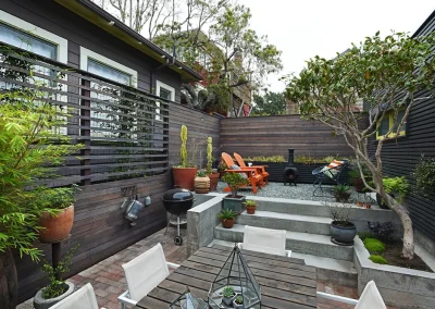 This outdoor project consisted of a complete rebuild of a turn-of-the-century garage/workroom as well as a redesign of the backyard area. Although there was limited space to begin with, clever planning allowed for the new garage to house a vehicle and a workbench. The remaining outdoor space was divided into an upper level gathering space and lower level dining area. Carefully crafted details, such as a slated dark exterior and fun pops of color, modernized the aesthetic of the garage. Transitional furniture was sourced to add to the warm and inviting look of the backyard.
