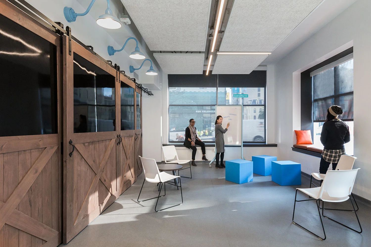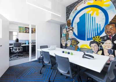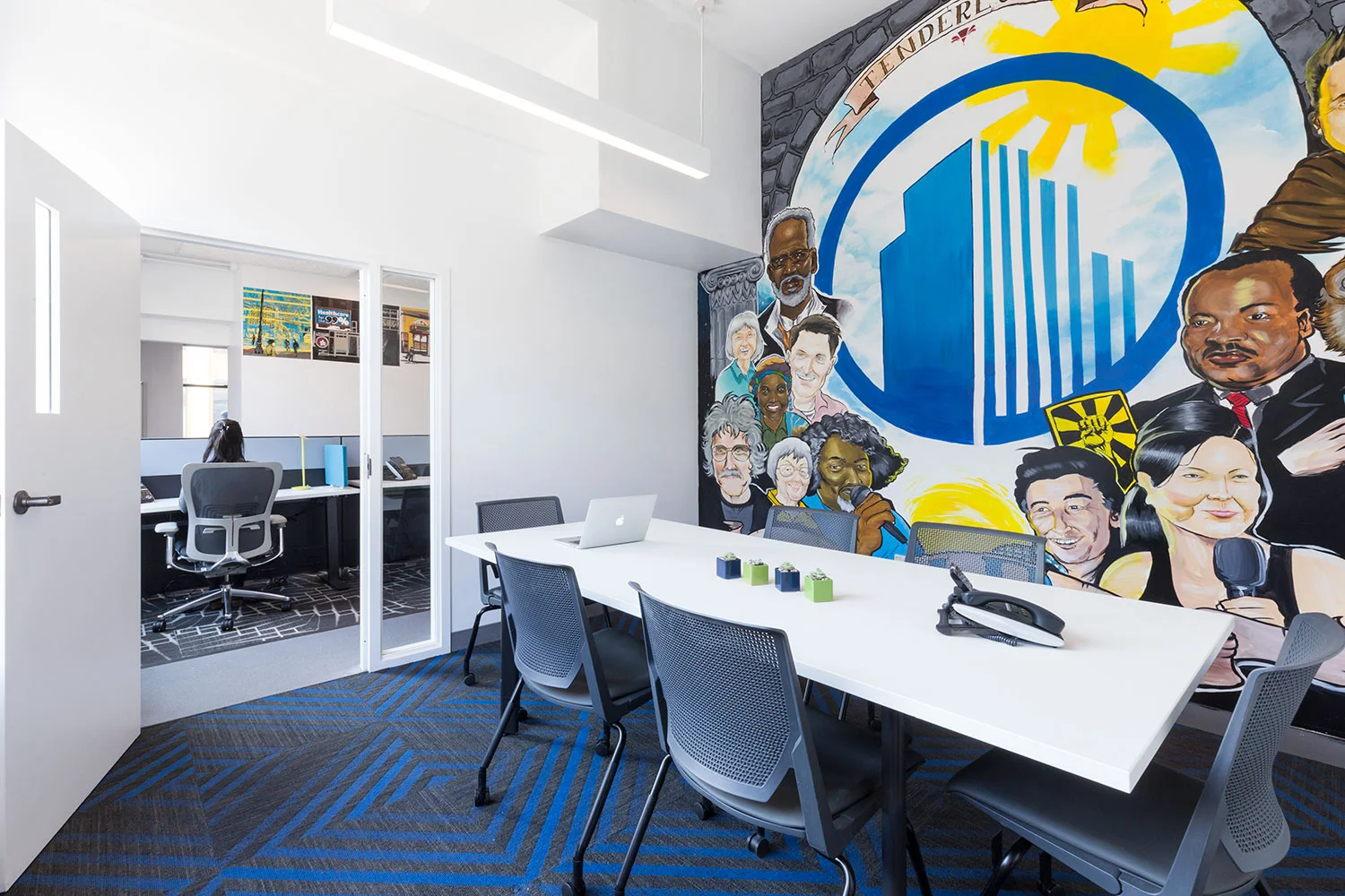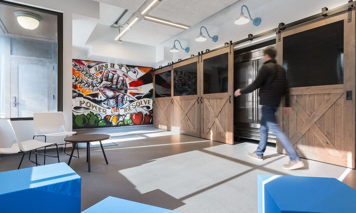 When TNDC, a nonprofit affordable housing developer, had the opportunity to occupy this corner location, they envisioned the space for two community-engaging programs: Community Organizing and Food Distribution. The location presented the perfect opportunity for TNDC to activate the streets and advocate for their tenants. Inside, a center wall was built to create separate spaces for the two programs’ needs. The front section is reserved for community gatherings and food distribution, while the back remains a functionable workspace for Community Organizing. Barn doors and rustic finishes draw upon the homey feelings of a farmer’s market, and the bold pattern of the carpet reflects the surrounding urban life. To soften the liveliness of the space, acoustical ceiling panels were integrated with the lighting in a simple pattern. Local muralists were commissioned by TNDC to further acknowledge the diversity and beauty of the Tenderloin neighborhood.