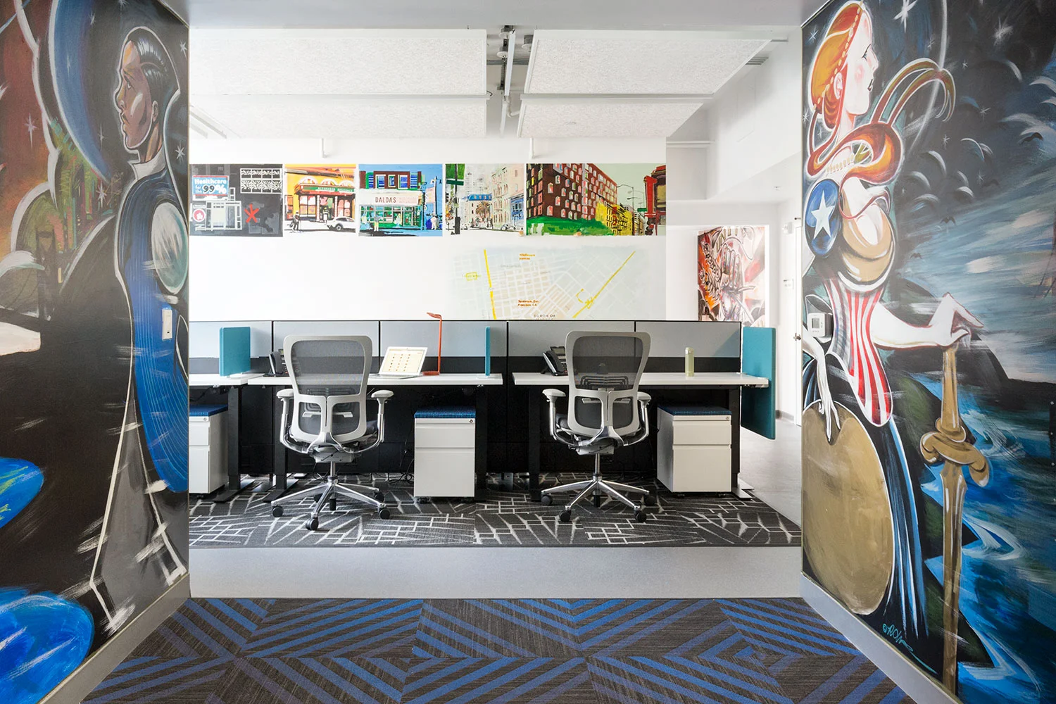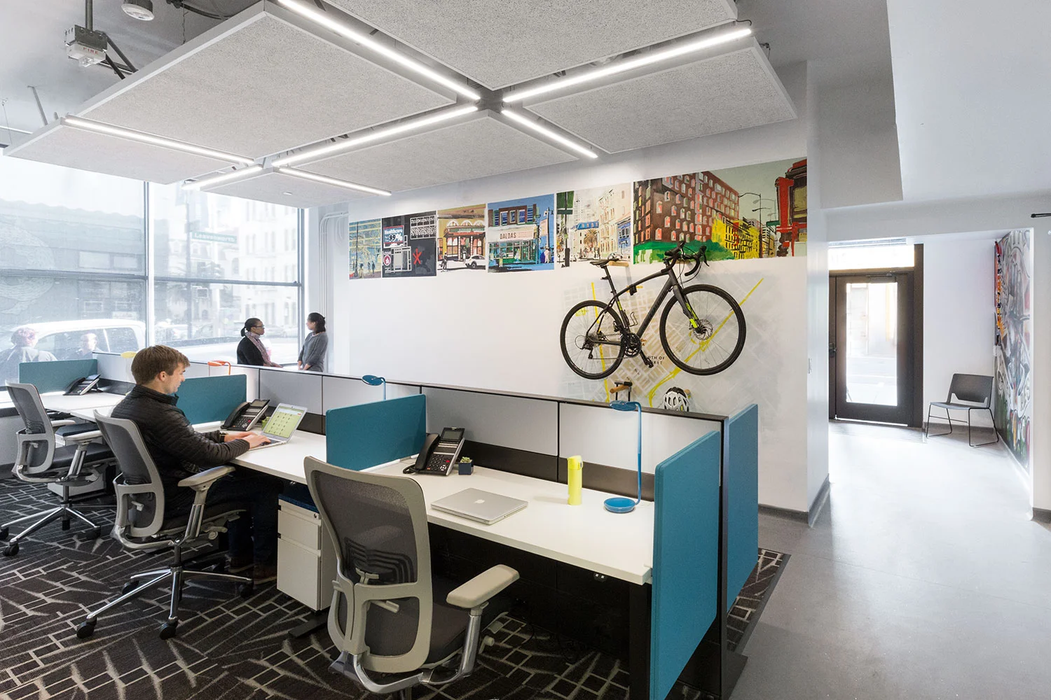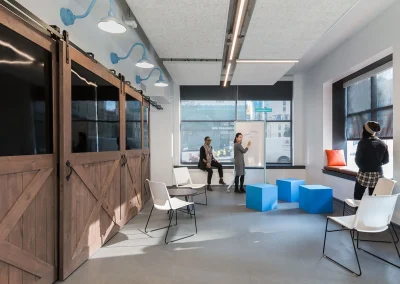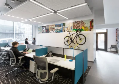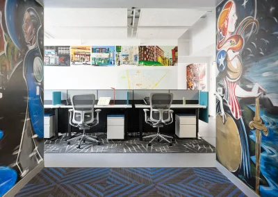 When TNDC, a nonprofit affordable housing developer, had the opportunity to occupy this corner location, they envisioned the space for two community-engaging programs: Community Organizing and Food Distribution. The location presented the perfect opportunity for TNDC to activate the streets and advocate for their tenants. Inside, a center wall was built to create separate spaces for the two programs’ needs. The front section is reserved for community gatherings and food distribution, while the back remains a functionable workspace for Community Organizing. Barn doors and rustic finishes draw upon the homey feelings of a farmer’s market, and the bold pattern of the carpet reflects the surrounding urban life. To soften the liveliness of the space, acoustical ceiling panels were integrated with the lighting in a simple pattern. Local muralists were commissioned by TNDC to further acknowledge the diversity and beauty of the Tenderloin neighborhood.
